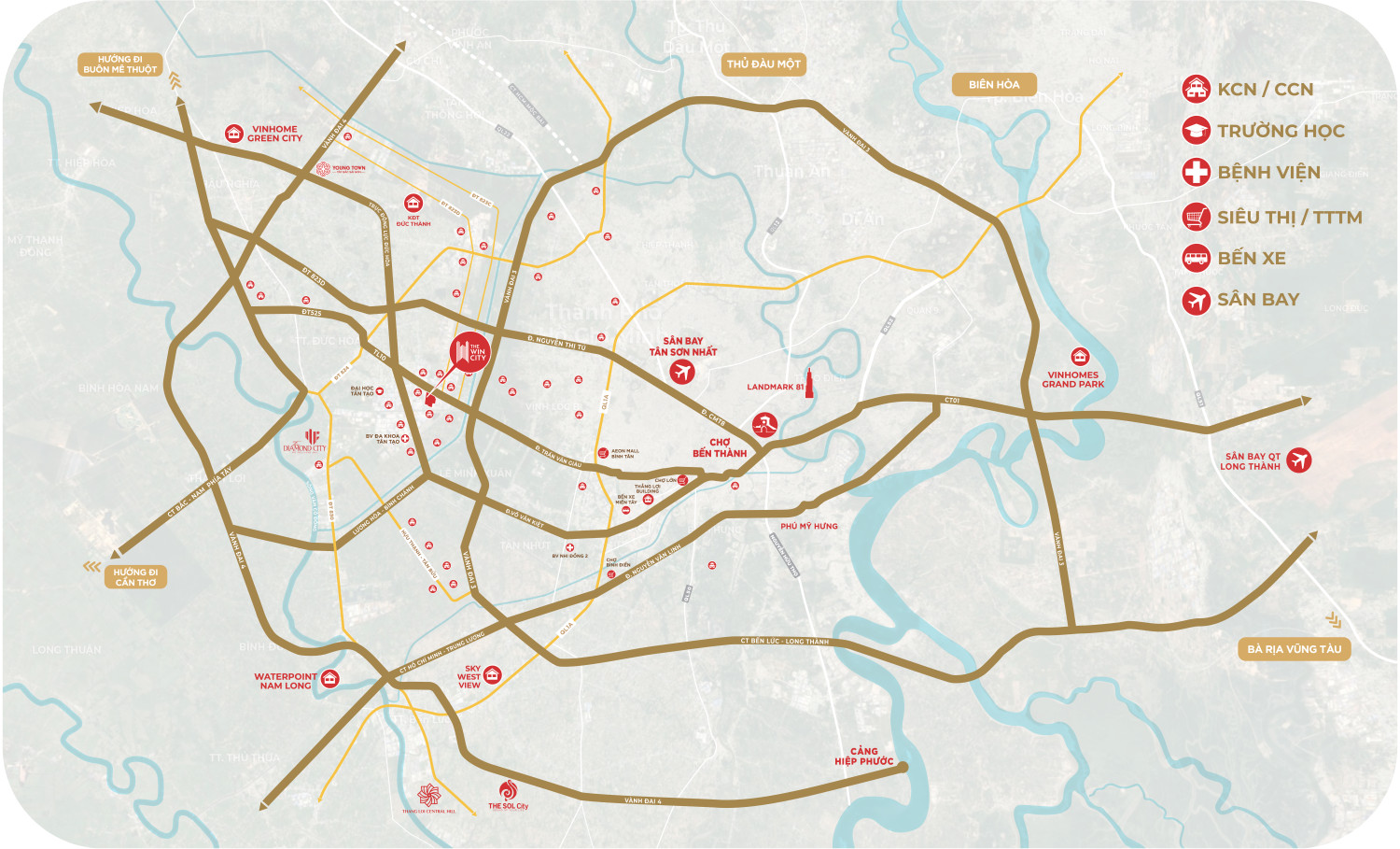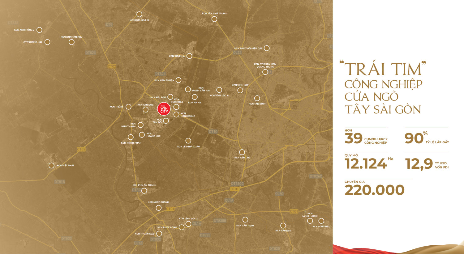 Không chỉ là cửa ngõ kết nối TP.HCM, The Win City nằm đúng tâm điểm “vành đai công nghiệp” phía Tây khi bao quanh dự án là loạt khu công nghiệp quy mô lớn như KCN Tân Đô, KCN Tân Đức, KCN Hải Sơn, KCN Đức Hòa 3, KCN Lê Minh Xuân mở rộng… trong bán kính chỉ vài km.