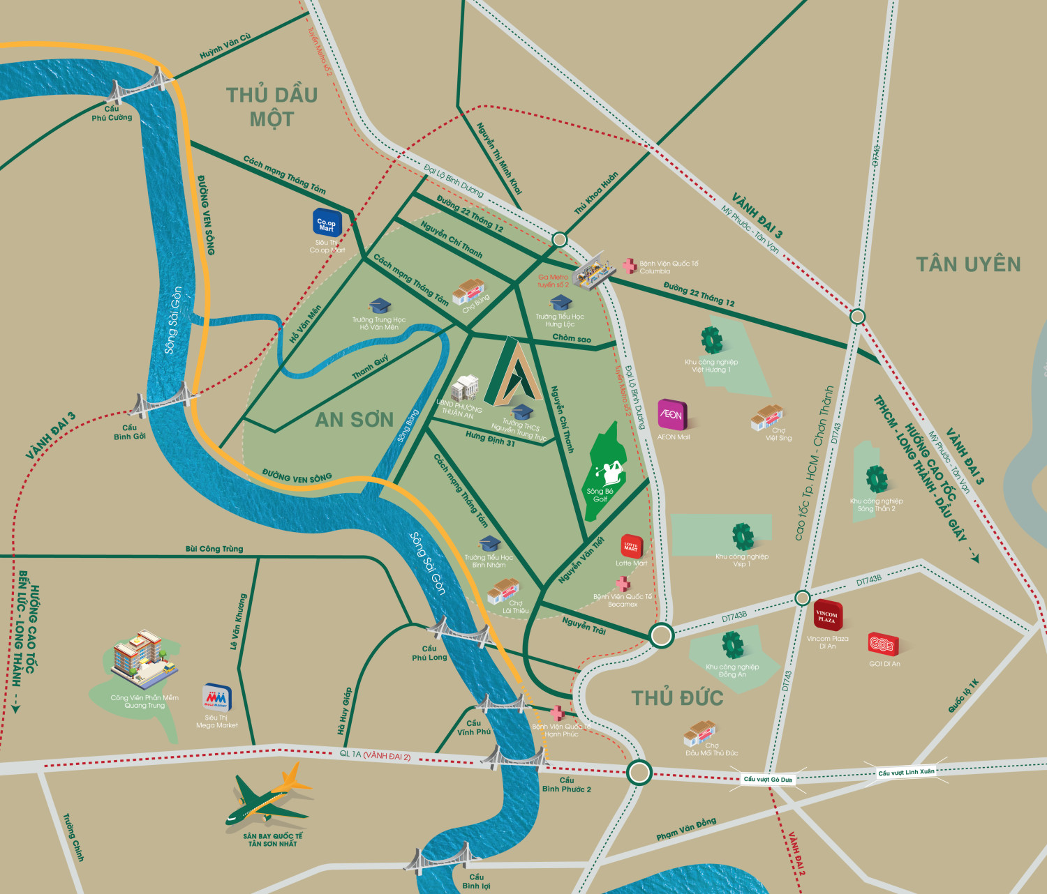 - 5–10 phút: Quốc lộ 13, Aeon Mall, Lotte, bệnh viện quốc tế.