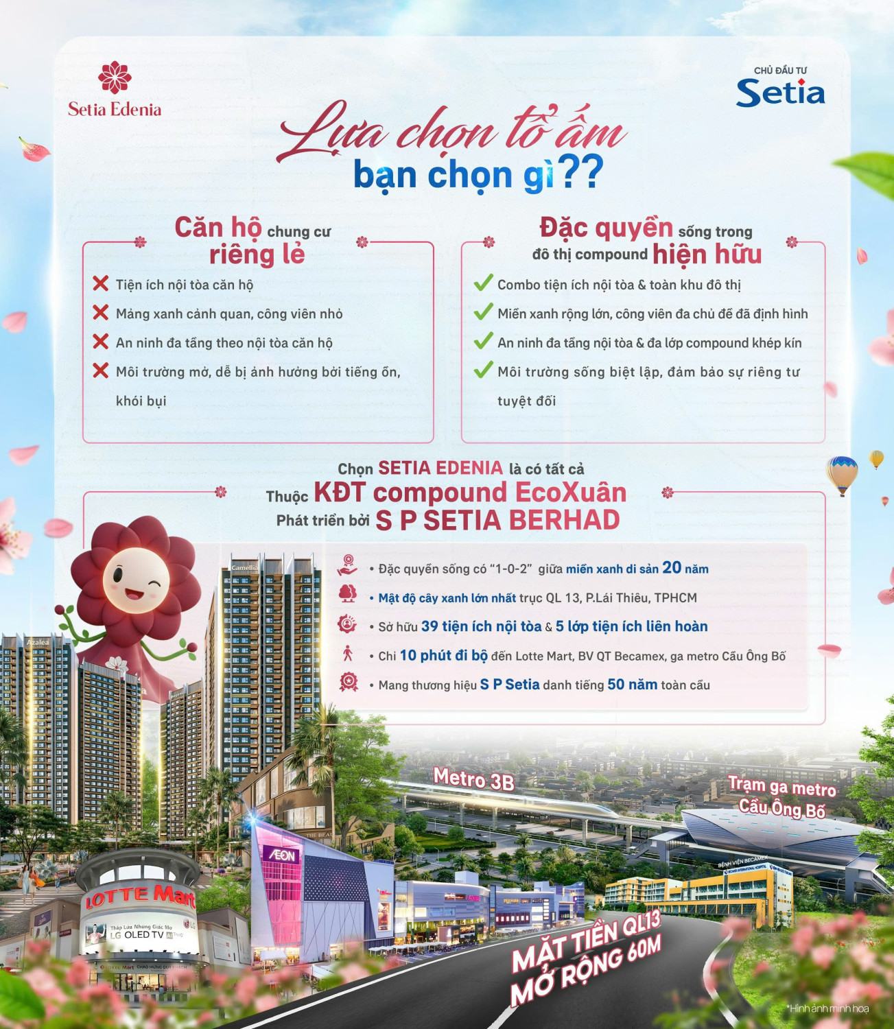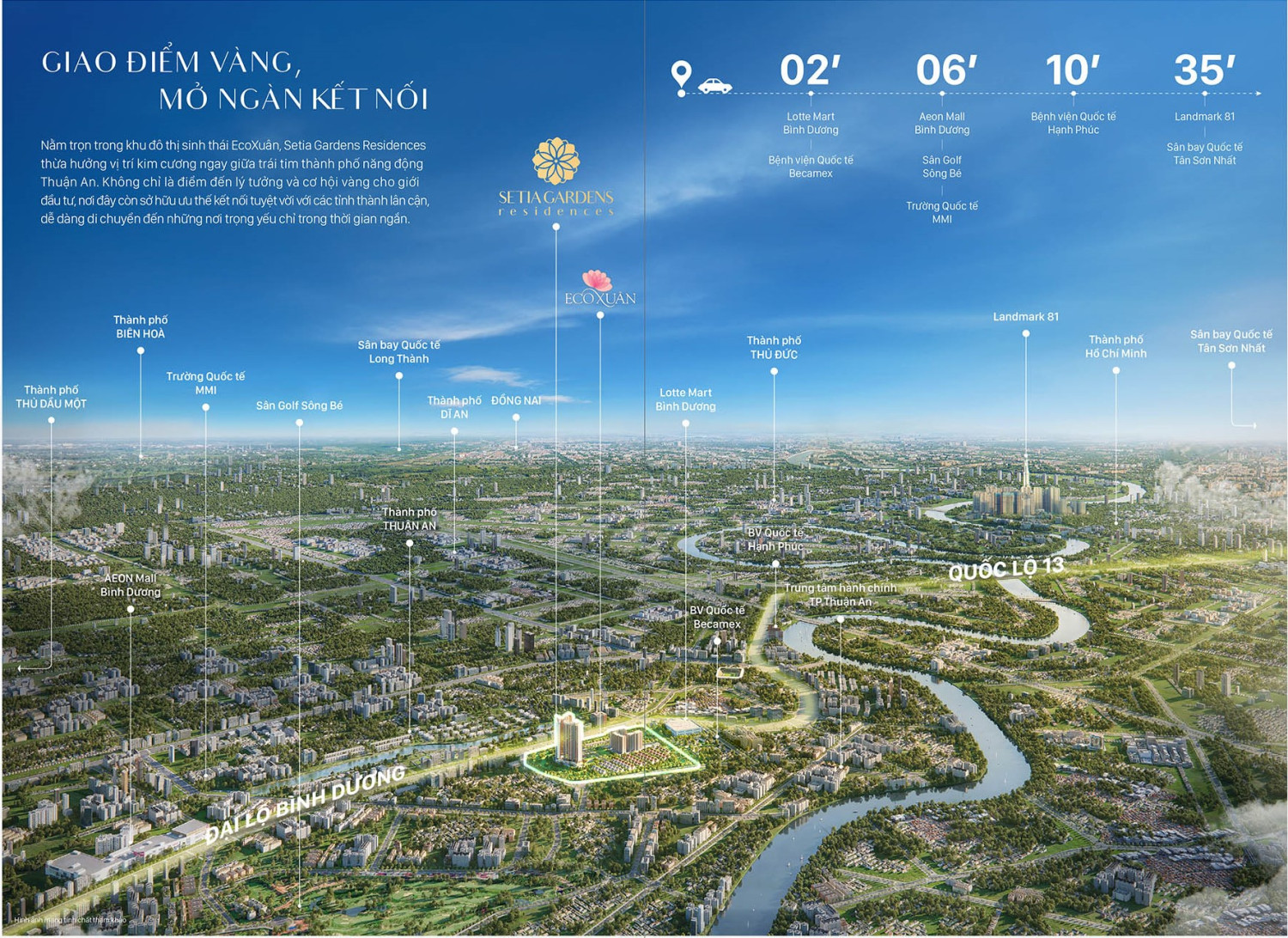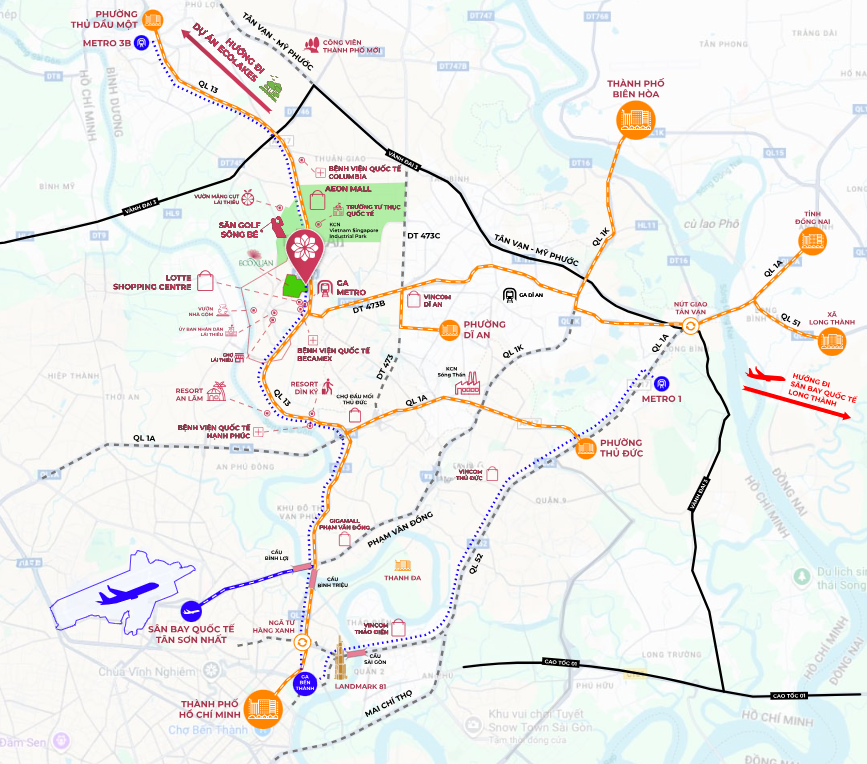 Nằm ngay mặt tiền Quốc lộ 13 trong khu đô thị EcoXuan, Setia Edenia giữ vị trí chiến lược của trục Đông Bắc TP.HCM – khu vực đang bứt tốc mạnh mẽ nhờ loạt dự án hạ tầng như mở rộng QL13, cao tốc kết nối liên vùng, tuyến DT743B và metro theo quy hoạch. Từ đây, cư dân dễ dàng di chuyển đến Thủ Đức, Quận 12, Thủ Dầu Một chỉ trong vài phút, tạo nên lợi thế lớn cho người đi làm, gia đình trẻ và cộng đồng chuyên gia.