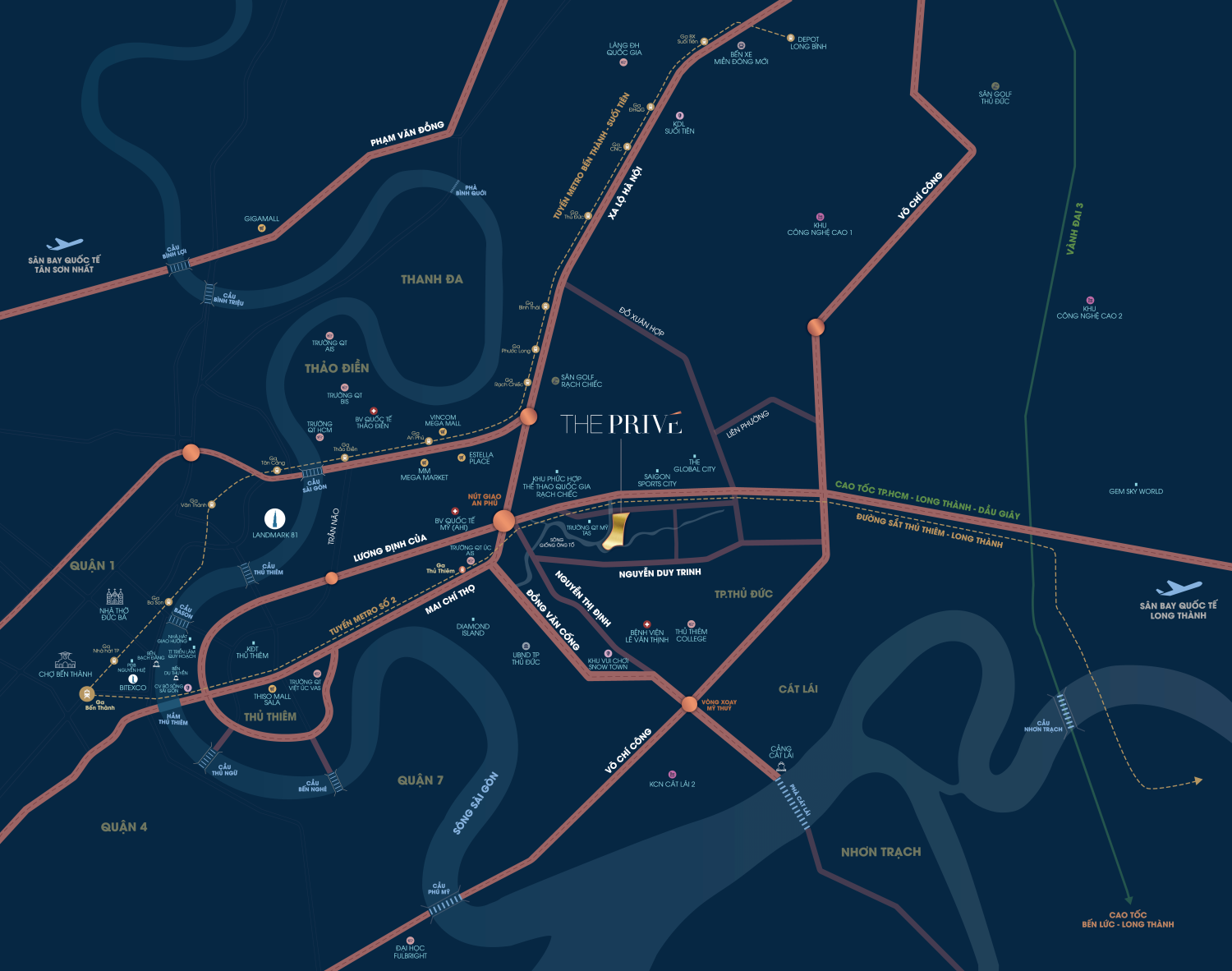 The Privé sở hữu vị trí mặt tiền Song Hành cao tốc TP.HCM - Long Thành - Dầu Giây, 3 mặt giáp sông Giồng Ông Tố và rạch Bà Dạt, tạo lợi thế phong thủy và view sông hiếm có ở khu Đông. Vị trí này đón đầu hạ tầng "siêu khủng" như Metro 1, Vành đai 2/3, cầu Thủ Thiêm 2/3/4, giúp giá trị tăng 20-30%/năm nhờ kết nối trung tâm. Đầu tư ngay để đón sóng khu Nam Rạch Chiếc thành trung tâm mới, gần Thủ Thiêm và Global City – nơi giá đất đang vọt lên.
