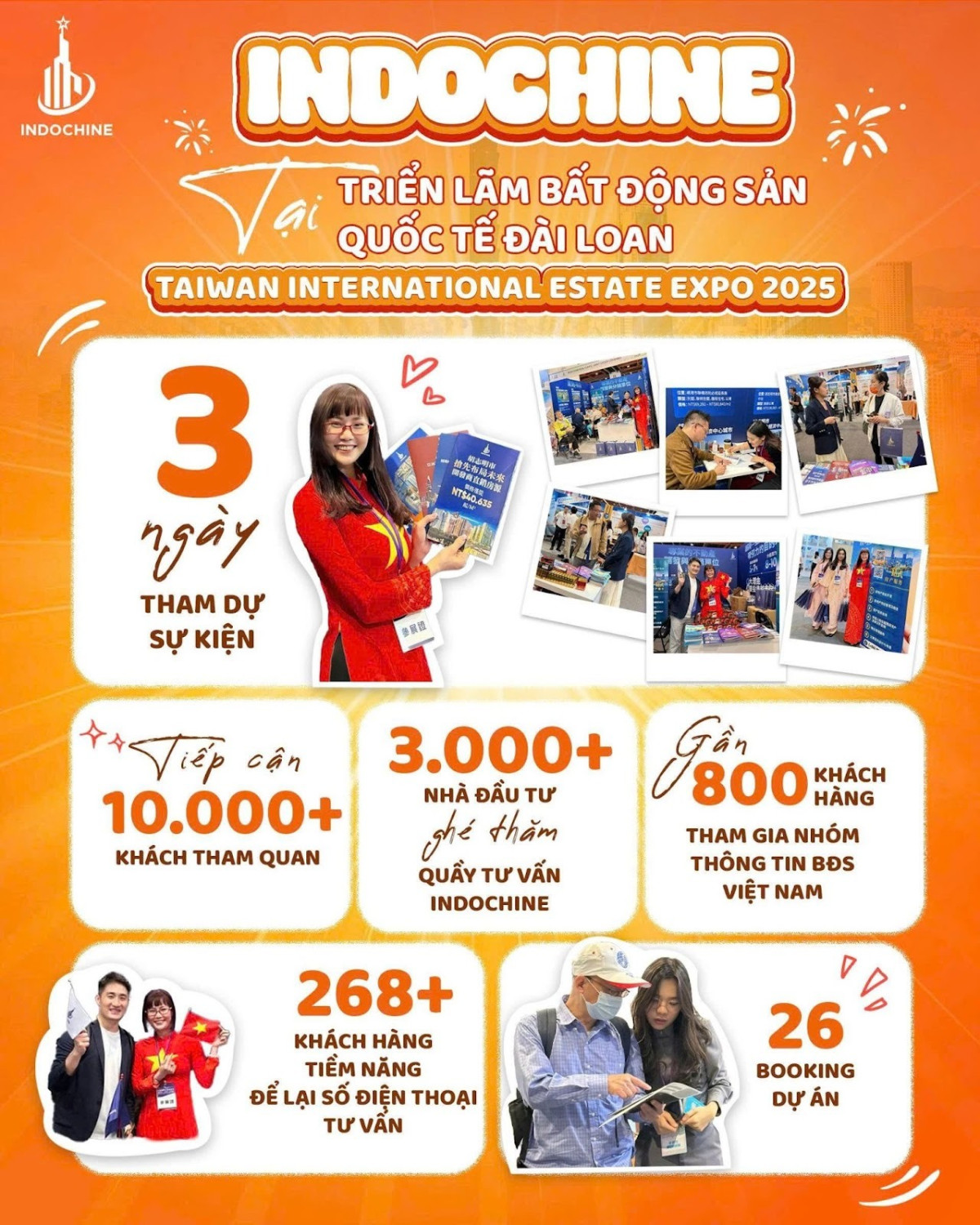 Chỉ trong ba ngày triển lãm, INDOCHINE đã tiếp cận hơn 10.000+ lượt khách đến tham quan, trong đó có 3.000+ khách hàng trực tiếp dừng chân tại quầy tư vấn để tìm hiểu về các dự án nổi bật. Hơn 800 nhà đầu tư quốc tế đã đăng ký tham gia nhóm “Thông tin bất động sản Việt Nam” do INDOCHINE vận hành, thể hiện mối quan tâm ngày càng lớn đối với thị trường Việt Nam. Đặc biệt, 268 khách hàng tiềm năng để lại thông tin để được tư vấn chuyên sâu, và 26 booking được giao dịch ngay tại sự kiện, đánh dấu bước tiến vượt bậc trong việc mở rộng kênh phân phối bất động sản quốc tế của INDOCHINE.